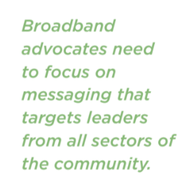 From the very start, broadband advocates need to focus on messaging that targets leaders from all sectors of the community—government, schools, health care, chambers of commerce, agricultural interests, and others. Specific messaging should be developed for key demographic groups, like senior citizens and parents of school-age children. This kind of messaging can help to build a coalition that can provide both input and support through combined community connections.
