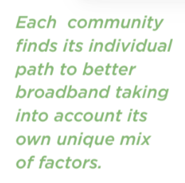 Over time, each community finds its individual path to better broadband taking into account its own unique mix of factors around geography, demography, past community experience, incumbent providers and prospective provider partners, community asset base, and community leadership. Adjacent and/or similar communities may make very different choices in achieving broadband improvements. One may take a strictly private-sector approach; another will engage in a public-private partnership; a third community may pursue a municipal or county utility model. These communities likely undertook steps like those below and came out in very different places. But what is most critical is that each community has the freedom to choose the broadband network that meets its residents’ needs.